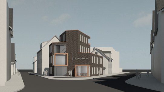 Der verklinkerte Baukörper passt sich zu allen Seiten an die Nachbarbebauung