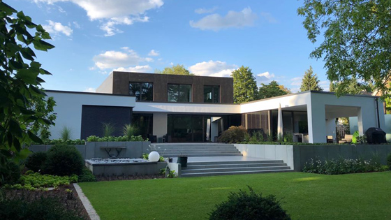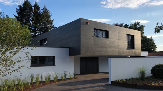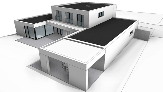 vorgezogenen, auskragenden Kubus im Obergeschoss ergänzt.